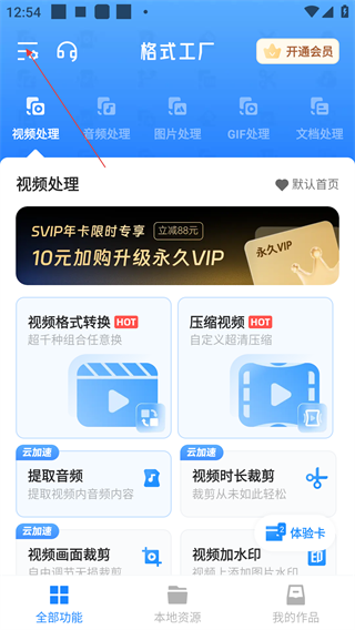 2、进入主界面后,可通过【视频处理】【音频处理】等分类,点击左上角的设置标志。