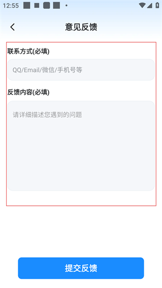 4、在【意见反馈】页面,需填写【联系方式】与【反馈内容】这两个必填项,完成后点击【提交反馈】即可将内容提交。