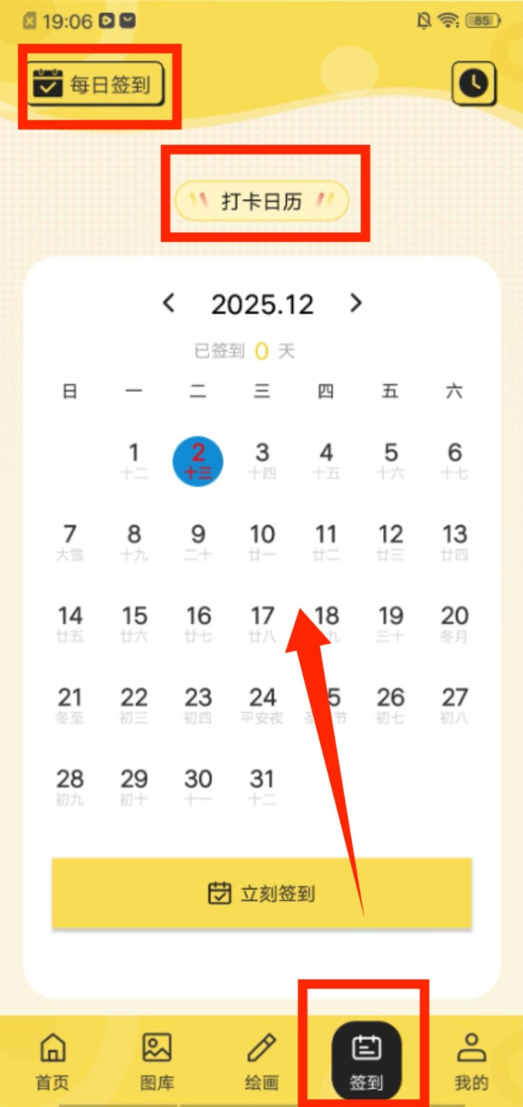 4、进入签到页面,点击 “打卡日历” 后选择日期,再点 “立刻签到” 完成当日的打卡操作。