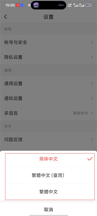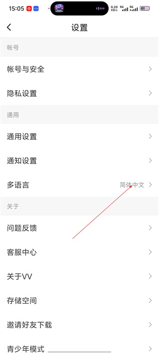 3、在【设置】页面中,包含【账号与安全】【隐私设置】等分类,【多语言】选项当前默认【简体中文】。