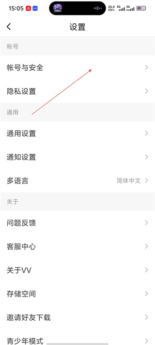 3、在设置中选择【账号与安全】,可查看【VV号】等账号信息,进行【手机号绑定】【密码设置】操作。