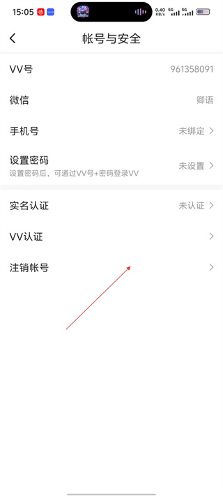 4、【账号与安全】页面支持【实名认证】【VV认证】【账号注销】,点击【账号注销】即可进入注销账号流程。
