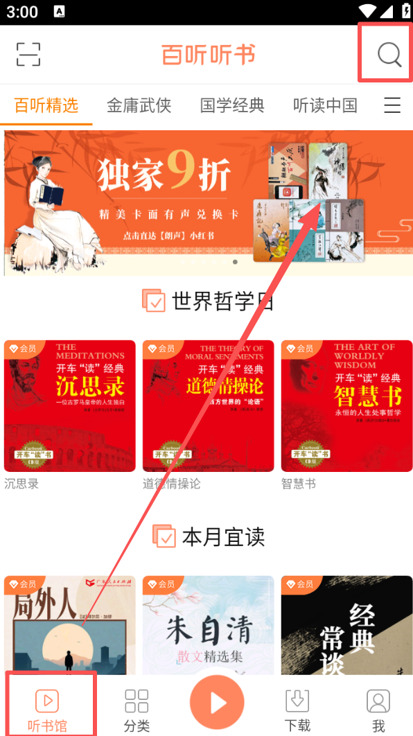 1、进入 “听书馆” 页面,点击右上角搜索图标, 查找想听的内容。