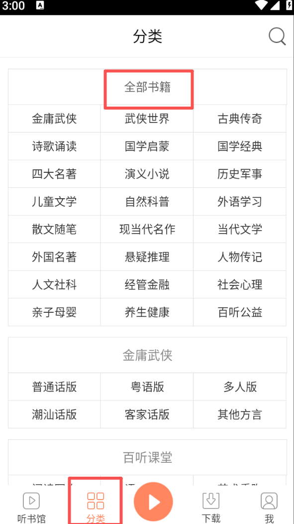 2、点击底部 “分类” 进入分类页面,选择 “全部书籍” 查找想听的内容。