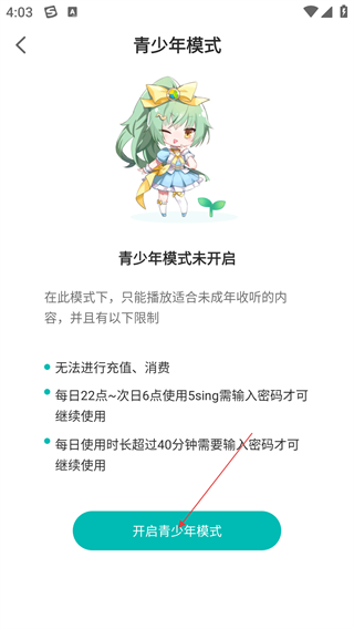 4、在青少年模式界面,点击【开启青少年模式】按钮,即可按照提示开启该模式,限制未成年使用内容和时长。