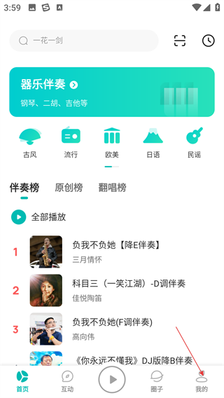 1、在首页可通过搜索框找伴奏,还能浏览【古风】【流行】等分类及伴奏榜,快速找到心仪伴奏。