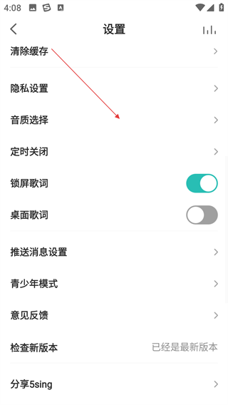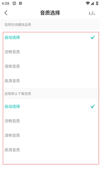 3、进入设置界面后,找到【音质选择】选项,点击可进入音质选择界面。