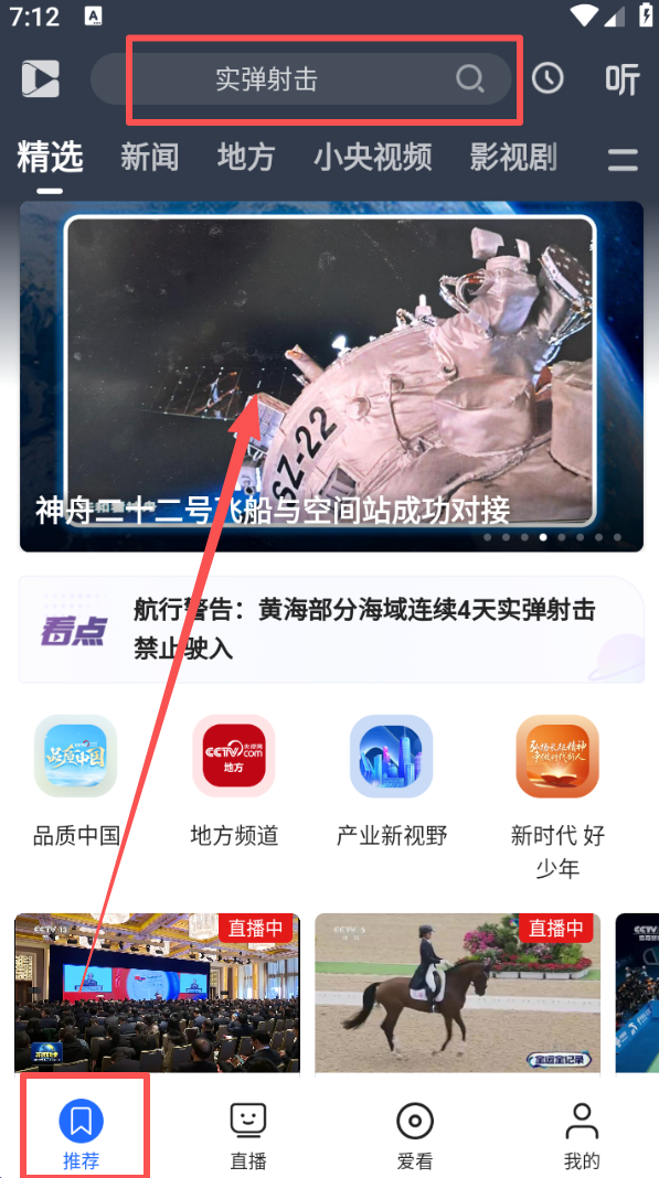 1、进入推荐页面,点击顶部搜索框输入内容,可查找对应视频,也能浏览精选的新闻、影视等内容。