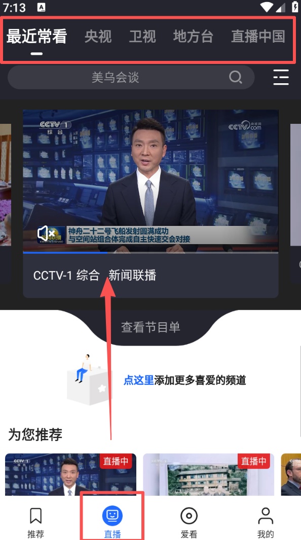 2、切换到直播页面,在 “央视”“卫视” 等分类下,可选择对应频道,查看正在播出的节目内容。