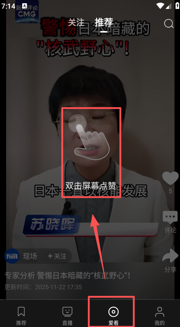 3、打开爱看页面,在视频播放界面双击屏幕,可完成点赞操作,还能通过侧边栏参与评论互动。