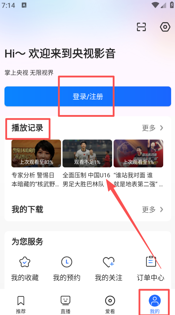 4、进入我的页面,点击 “登录 / 注册” 完成账号操作后,可查看播放记录、管理已下载的内容。