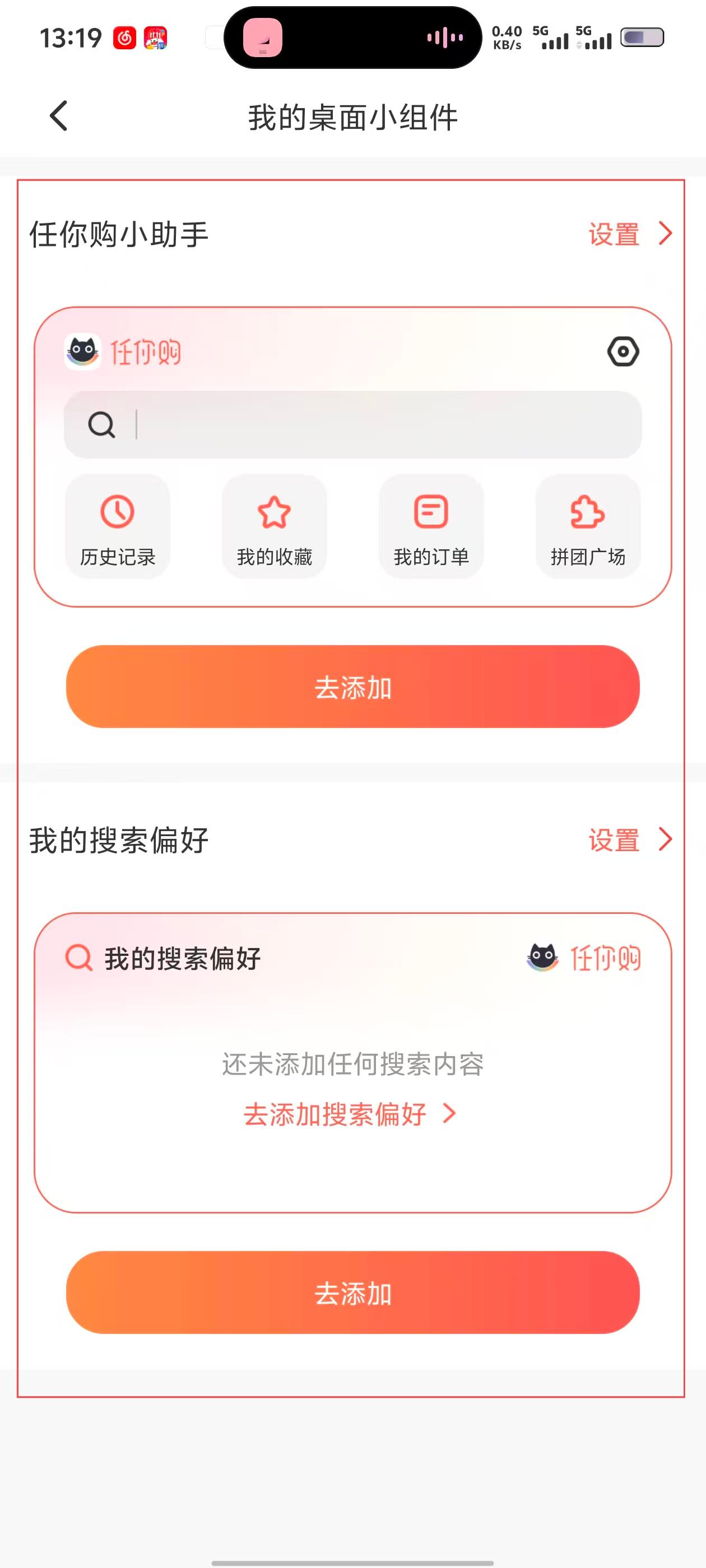 4、在桌面小组件设置页面,可根据需求点击“去添加”按钮,添加任你购小助手或我的搜索偏好的桌面小组件,方便快速使用软件功能。
