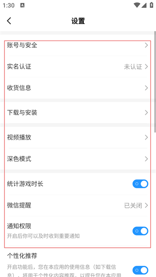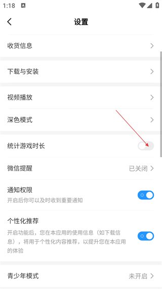 3、在设置页面中,找到“统计游戏时长”选项,点击其右侧的开关按钮,即可开启该功能。