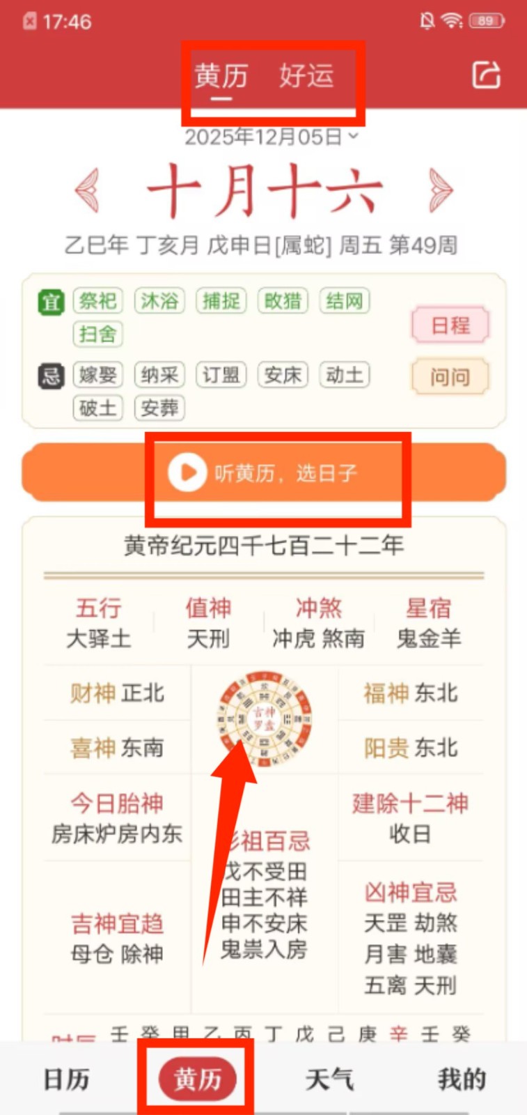 2、切换到黄历页面,在 “黄历”“好运” 标签下,点击 “听黄历,选日子”,可获取当日的宜忌等内容。