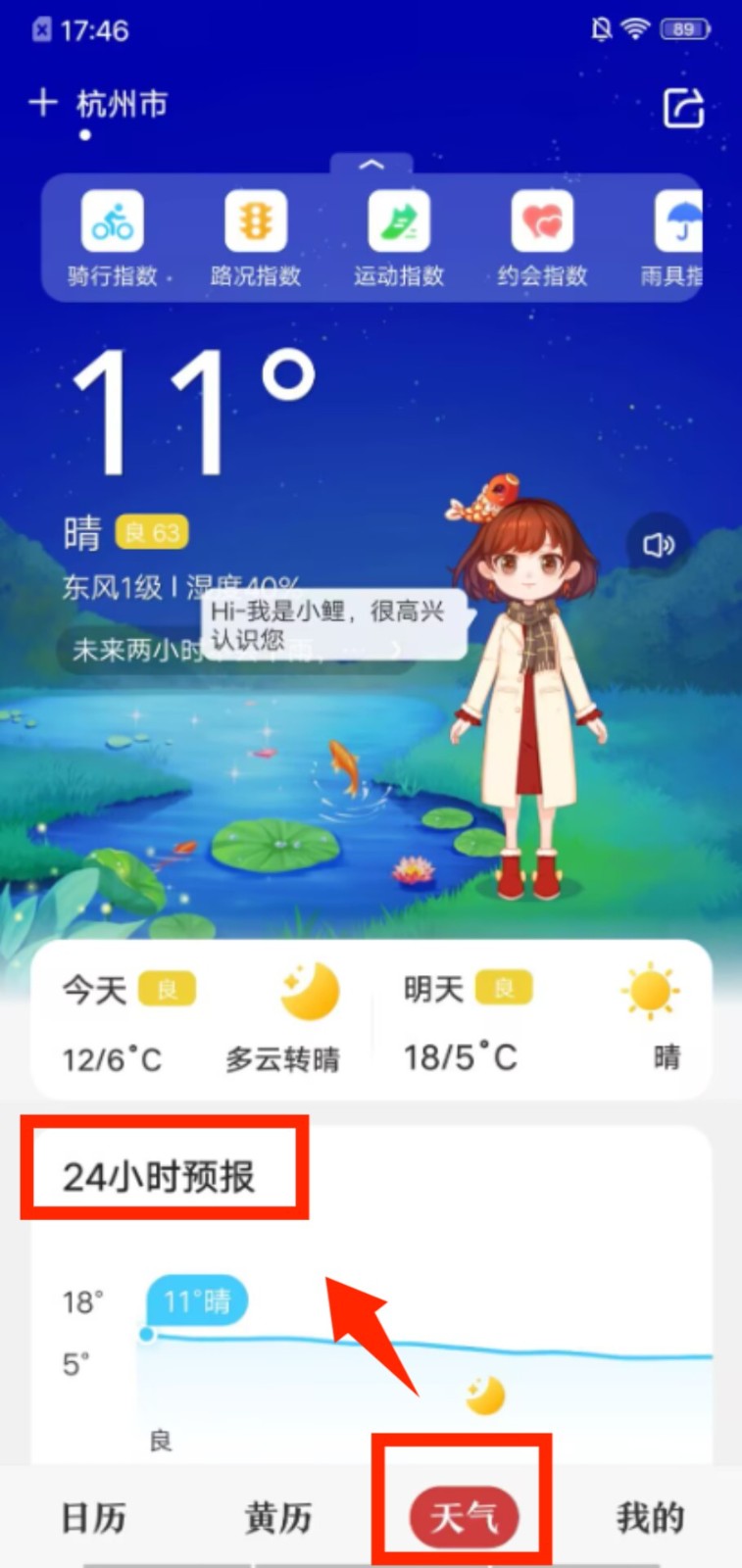 3、打开天气页面,查看当前城市的气温与天气状况,在 “24 小时预报” 板块了解近期的温度变化。