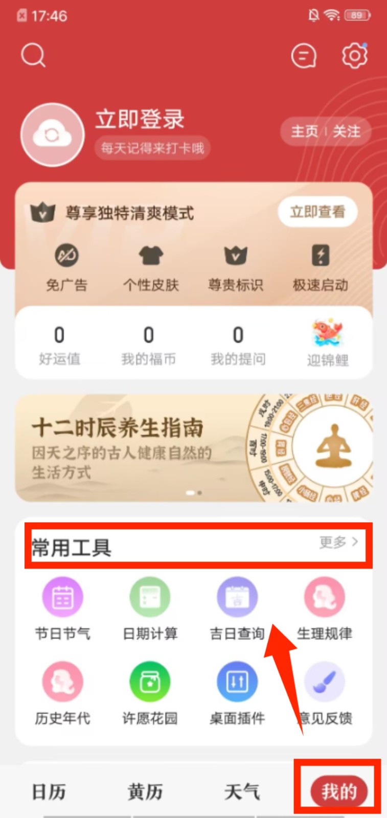 4、进入 “我的” 页面,在常用工具板块选择 “节日节气”“日期计算” 等功能,可使用对应的工具服务。