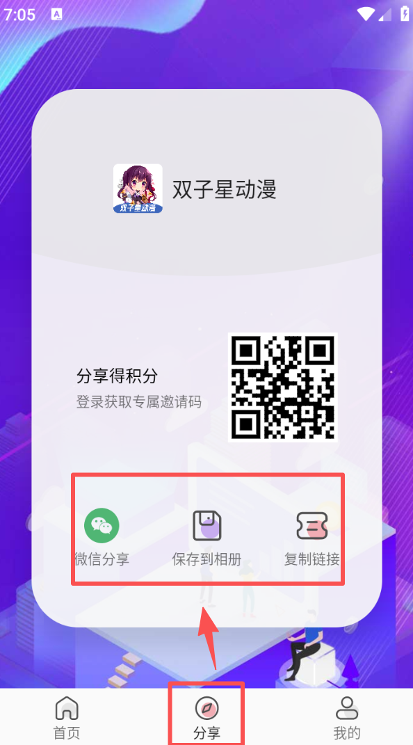 3、点击底部 “分享” 按钮,在弹出的选项中选择微信、复制链接等方式,可将内容分享给他人并获取积分。