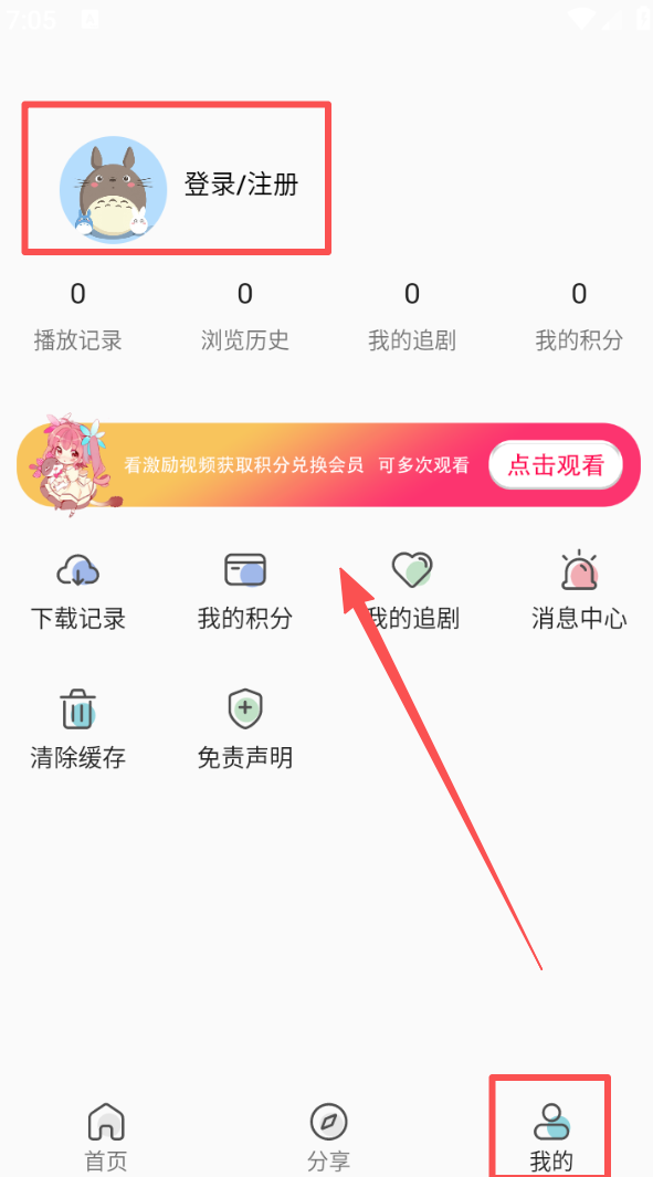 4、进入 “我的” 页面,点击 “登录 / 注册” 完成账号操作后,能查看播放记录、管理追剧列表等个人内容。