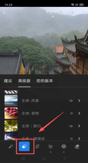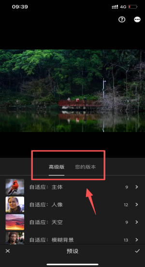 4、进入预设选择自适应人像天空,高级版瞬间完成背景虚化与调色。