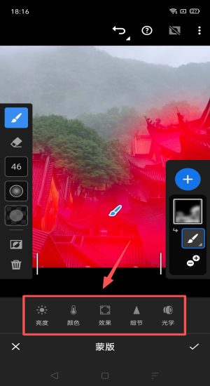 2、导入照片后滑动调节亮度颜色效果细节,光学蒙版精准局部修图。