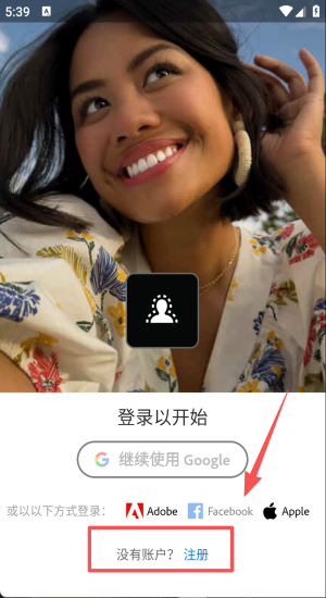 1、点击“继续使用Google”或Adobe账号登录,无账户可先注册再进入。