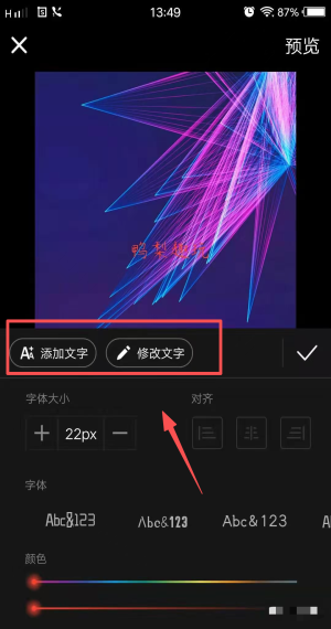 3、进入编辑页,点“添加文字”输入欢迎语并调22px大小居中。