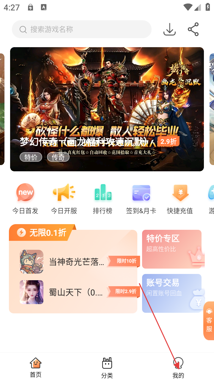 1、在游戏平台首页,可浏览今日首发、今日开服等游戏信息,点击【我的】进入个人页面。