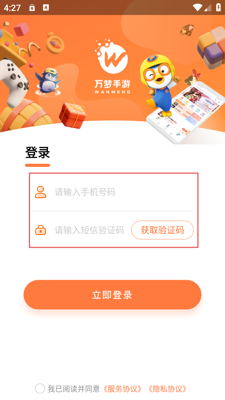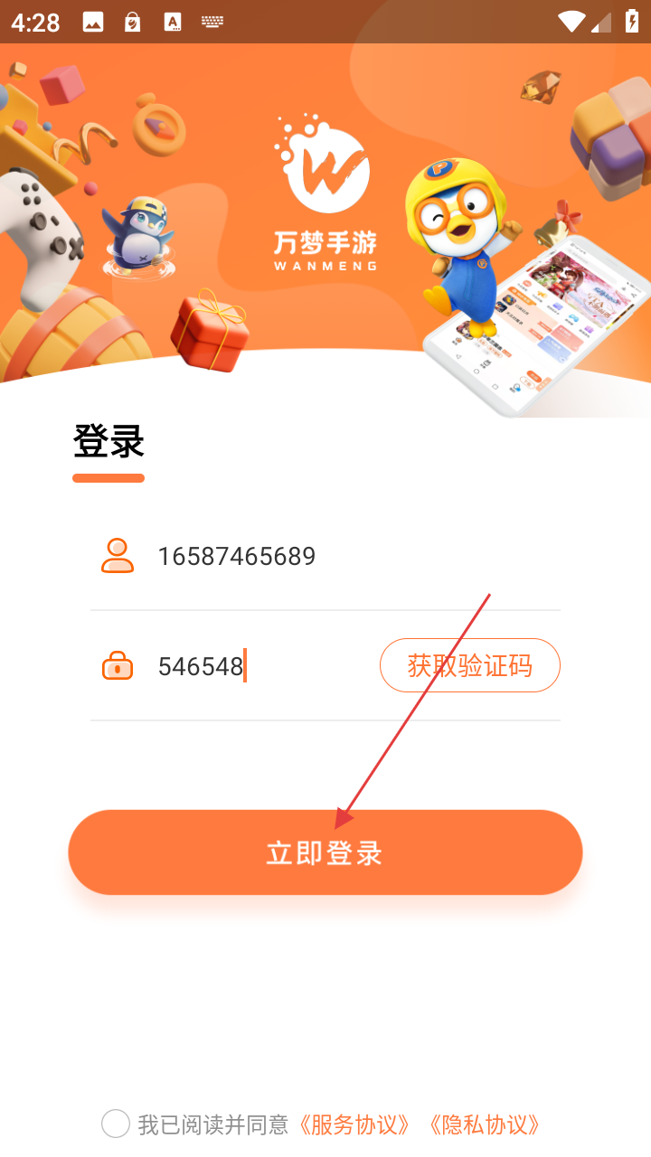 4、输入手机号码和验证码后,点击【立即登录】即可完成登录,享受平台的更多游戏优惠和服务。