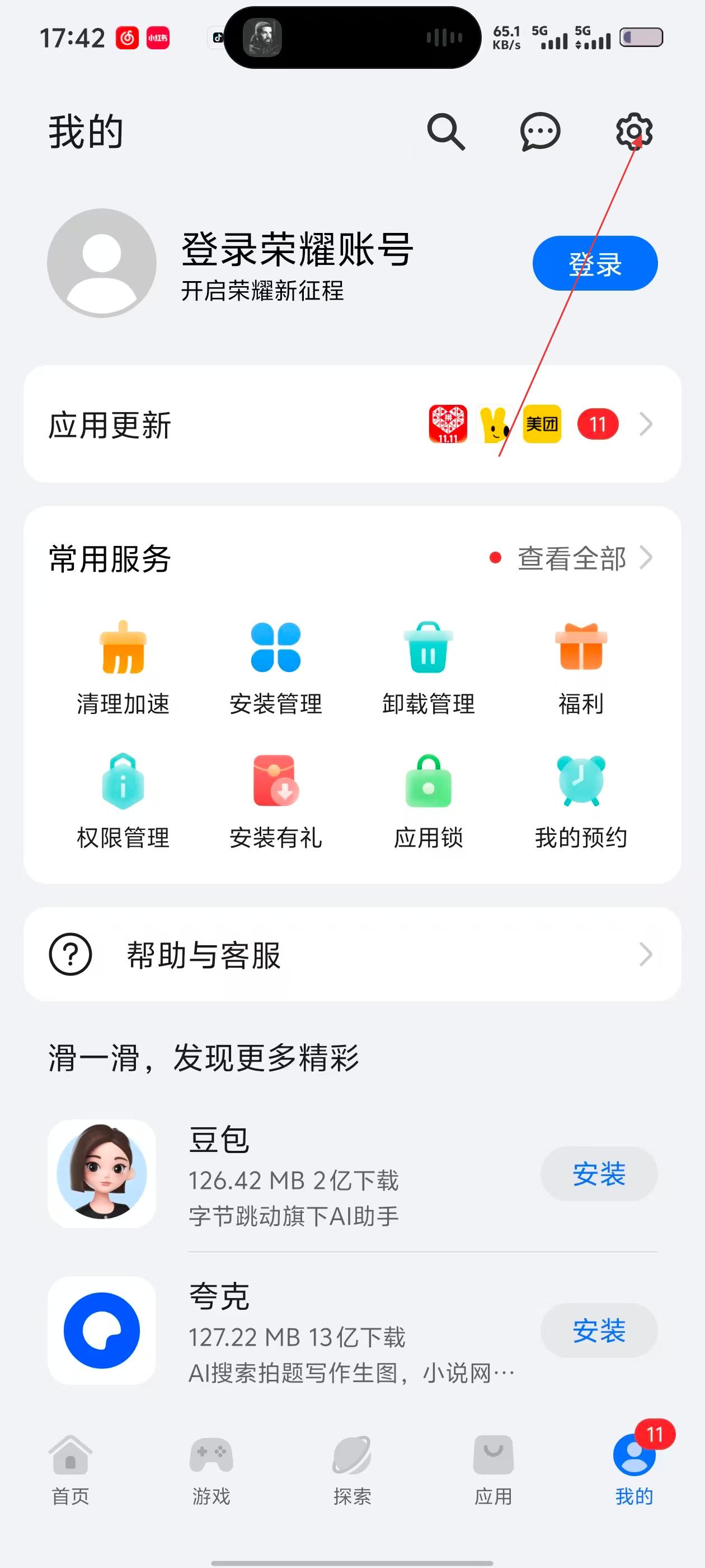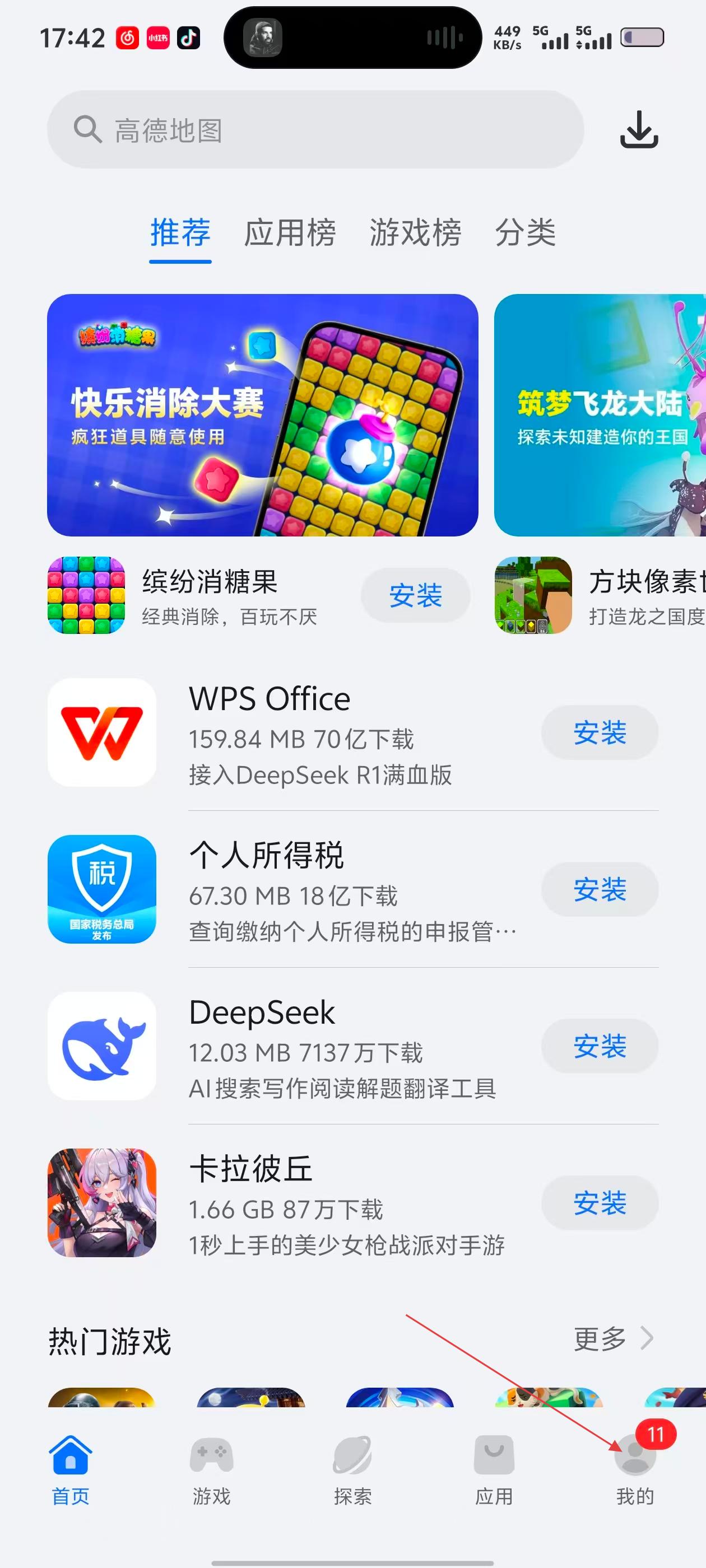 1、在荣耀应用市场首页,可浏览推荐、游戏、探索、应用等板块内容,点击【我的】进入个人页面。