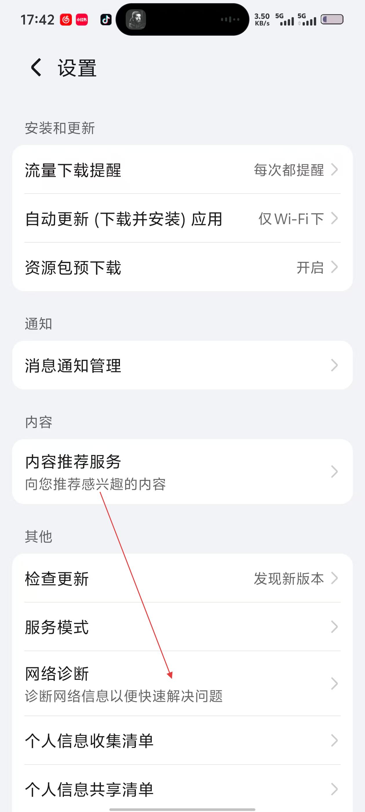 3、在设置界面,点击【网络诊断】进入网络诊断页面,还能对安装和更新、通知、内容等进行设置。