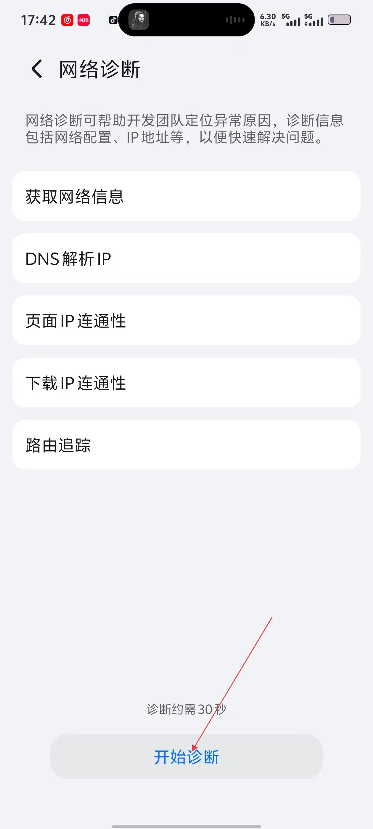 4、在网络诊断页面,点击【开始诊断】可帮助开发团队定位网络异常原因,诊断约需30秒,还能进行获取网络信息、DNS解析IP等操作。