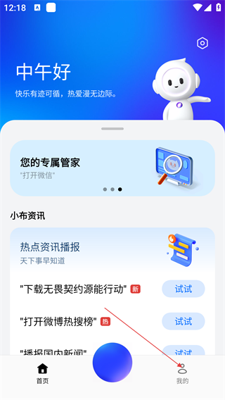 1、在首页可查看【小布资讯】中的各类功能入口,点击底部【我的】按钮,可进入个人中心页面使用更多功能。