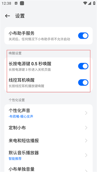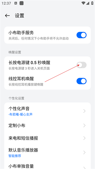 3、在【设置】页面的【唤醒设置】板块,可操作【长按电源键0.5秒唤醒】的开关,自定义小布助手的唤醒方式。