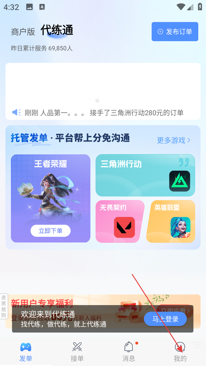 1、进入【代练通】商户版,若需咨询客服可点击右下角【我的】,界面展示有【王者荣耀】【三角洲行动】等游戏代练入口及新用户福利。