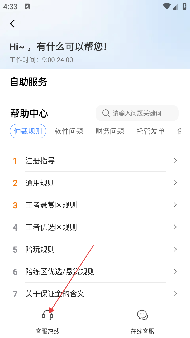 3、在客服界面,若需电话咨询可点击左下角【客服热线】,也可在帮助中心查看【仲裁规则】【软件问题】等分类信息。