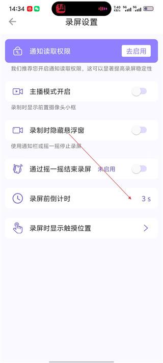 3、进入【录屏设置】页面,可配置【通知读取权限】【录制时隐藏悬浮窗】等功能,默认【录屏前倒计时】为3秒,点击该选项可调整时长。