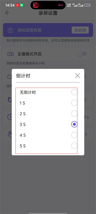4、点击【录屏前倒计时】后,会弹出选择弹窗,支持设置【无倒计时】【1S】至【5S】等选项,选中后录屏启动前的等待时长会同步更新。