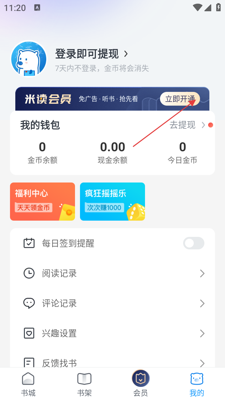 2、在“我的”页面,点击【米读会员】区域的【立即开通】按钮。