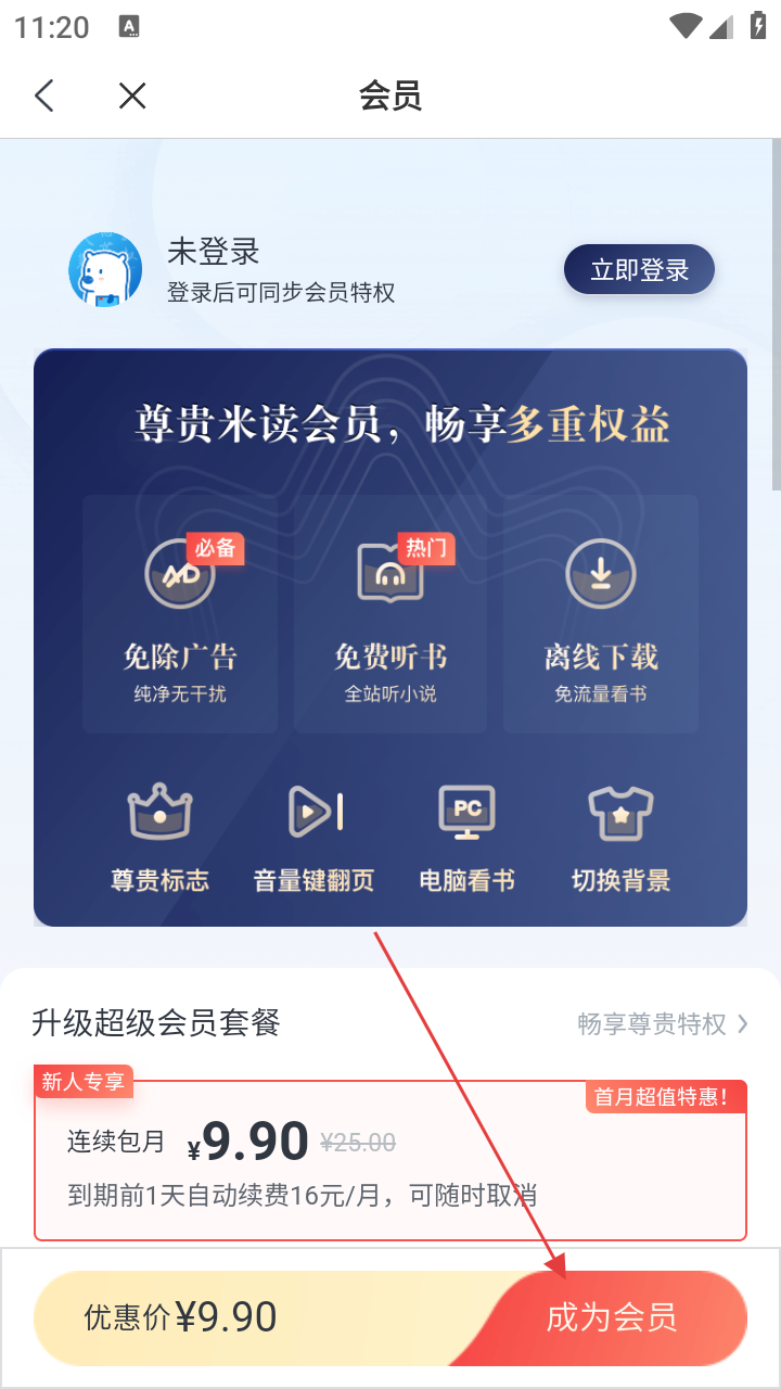 3、进入会员页面后,可看到新人专享的连续包月会员套餐,点击【成为会员】按钮。