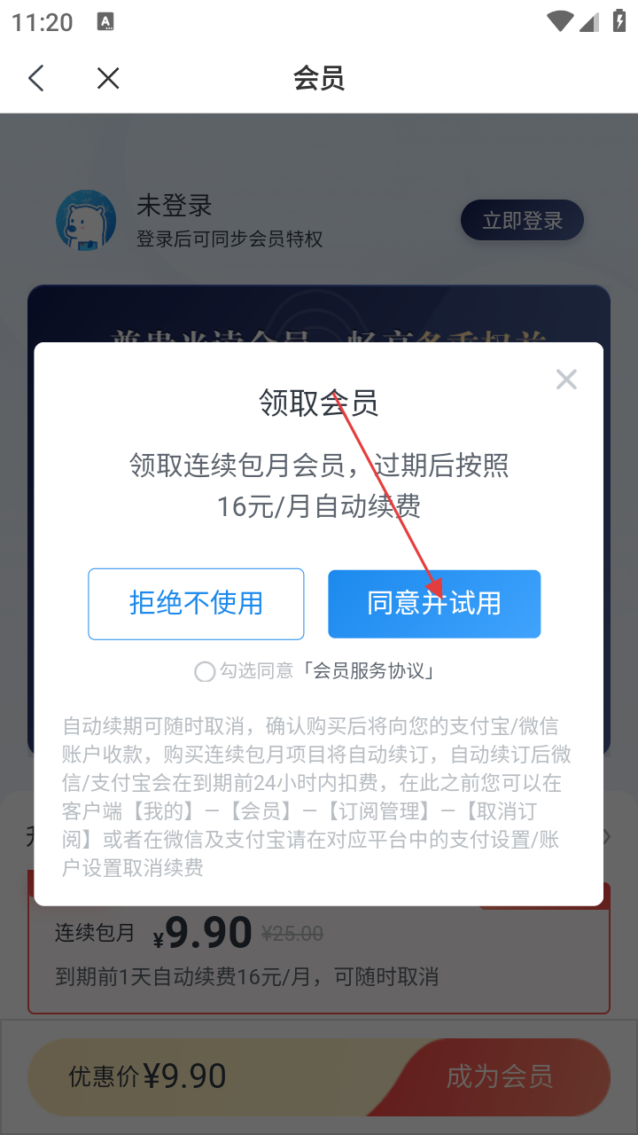 4、在弹出的“领取会员”提示框中,勾选同意“会员服务协议”,然后点击【同意并试用】按钮,按照提示完成支付,即可开通会员。