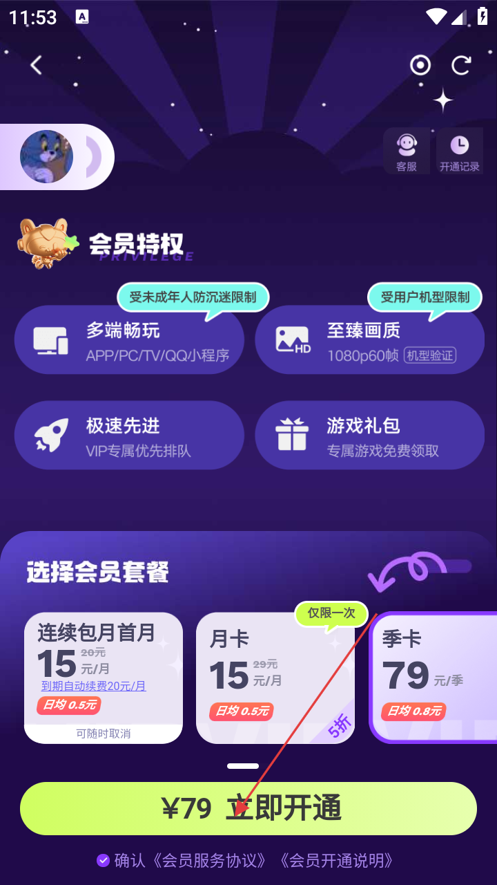 3、在会员开通页面,选择会员套餐,如【季卡】,点击【立即开通】按钮。
