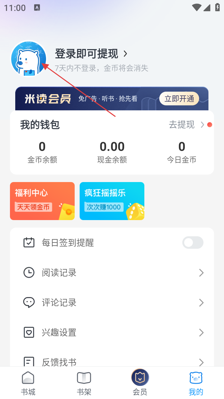 1、在米读小说中用户只要在软件内阅读小说就可以获得一定的金币。