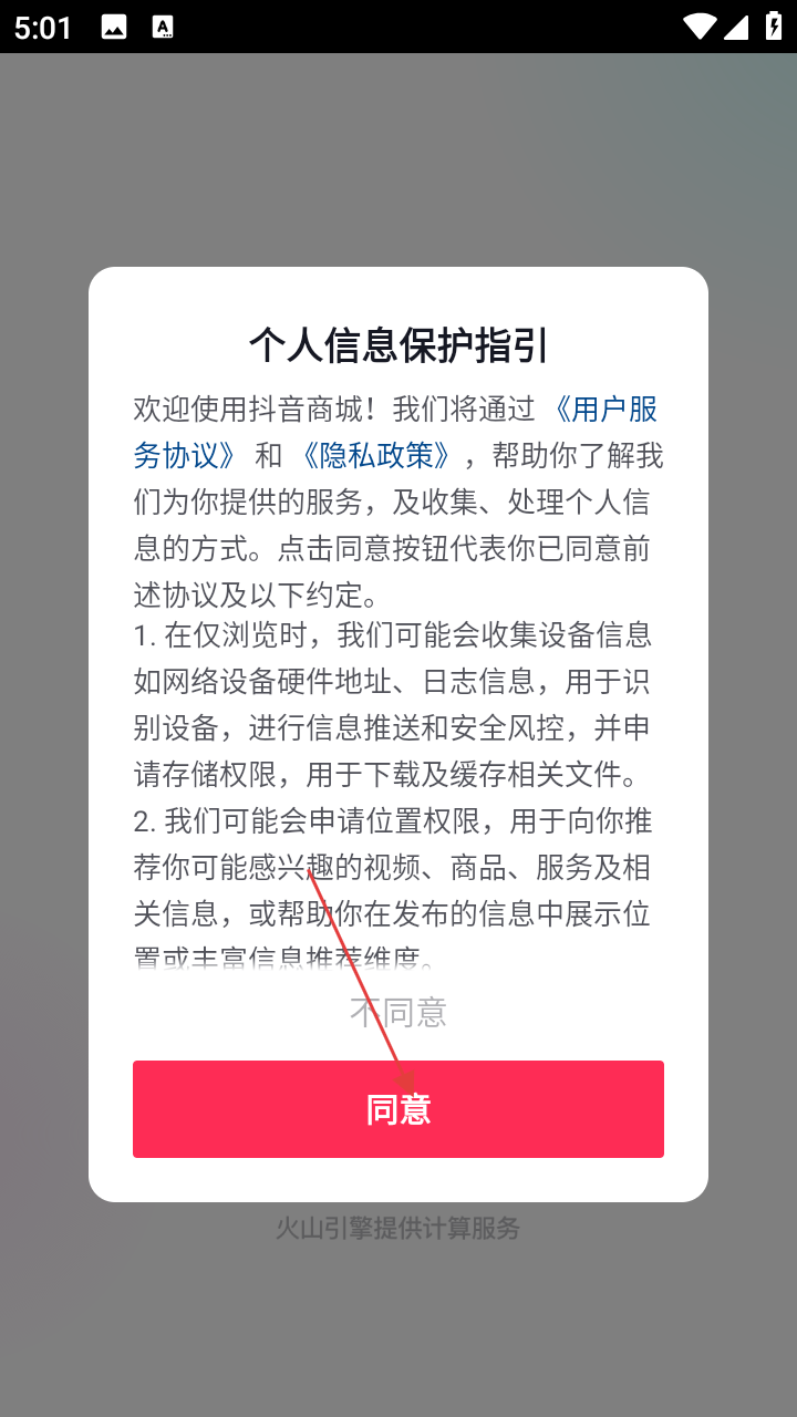 1、进入抖音商城,会弹出【个人信息保护指引】弹窗,点击【同意】,即可继续使用商城功能。