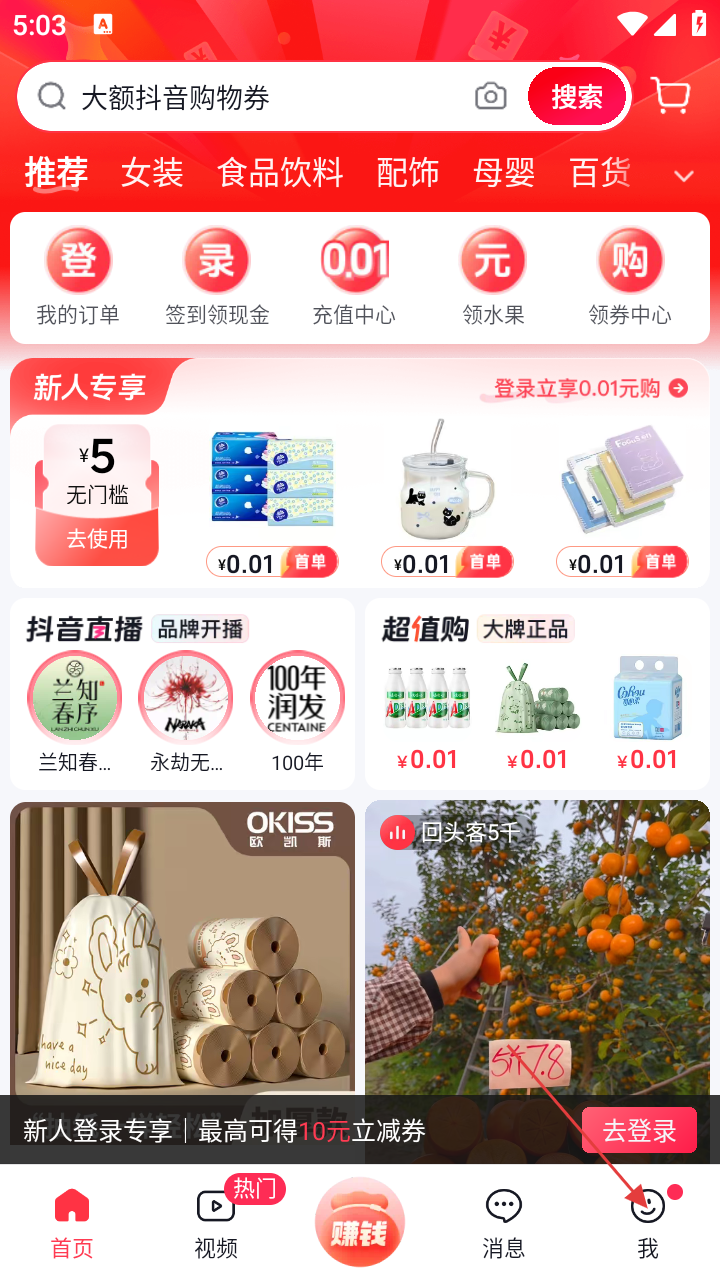 2、在抖音商城首页,点击底部【我】,进入个人相关页面,可进行登录等操作。