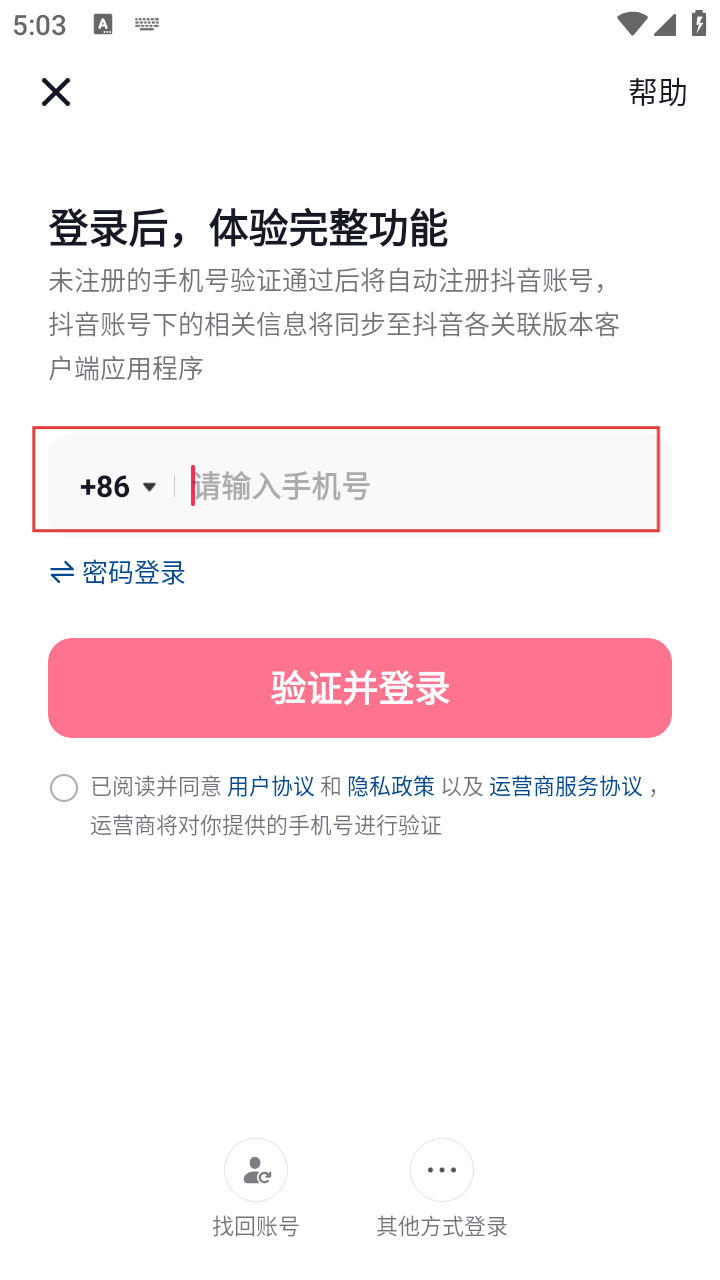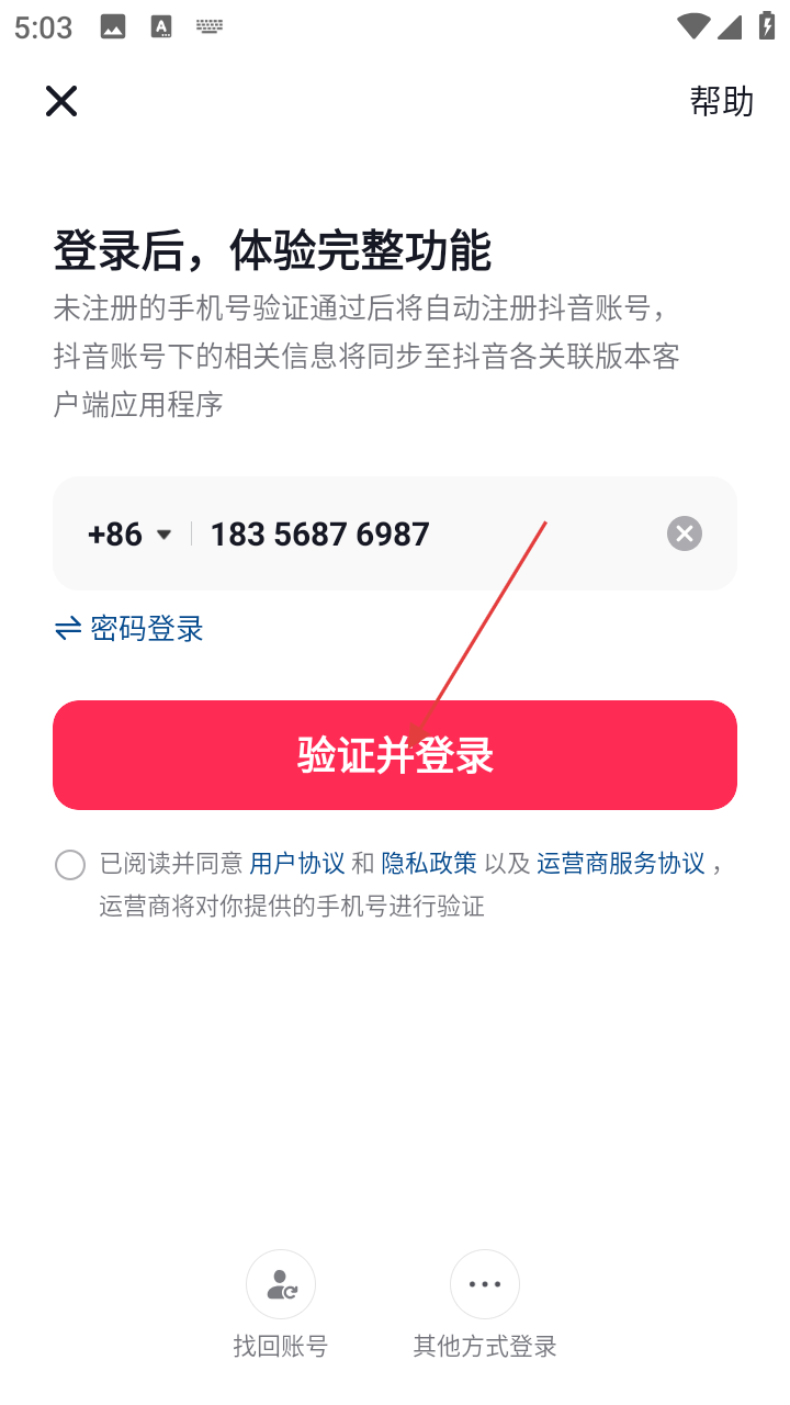 3、在登录页面,输入手机号,勾选同意相关协议后,点击【验证并登录】,进行账号登录。