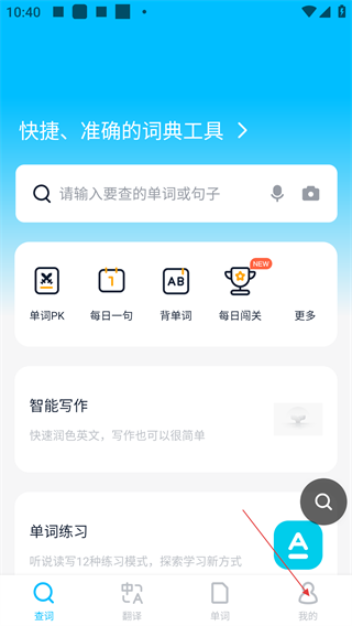 1、进入词典工具主界面,可通过搜索框查单词/句子,点击底部【我的】进入个人中心。