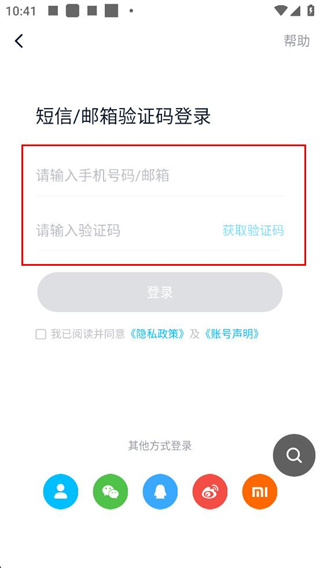 3、在登录界面,可选择短信/邮箱验证码登录,也可通过微信、微博等其他方式登录,需先勾选同意相关协议。
