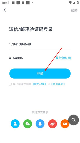 4、在短信验证码登录页,输入手机号码及获取的验证码,勾选协议后点击【登录】按钮,即可完成账号登录。