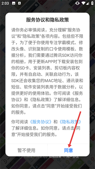 1、在服务协议和隐私政策弹窗中,阅读相关内容后,点击【同意】按钮,进入应用的后续页面。