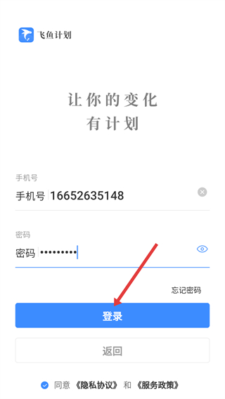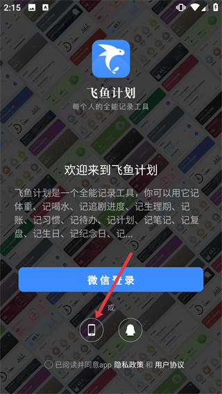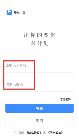 2、进入飞鱼计划欢迎页后,选择【手机】登录方式,进入对应的账号登录信息填写页面。